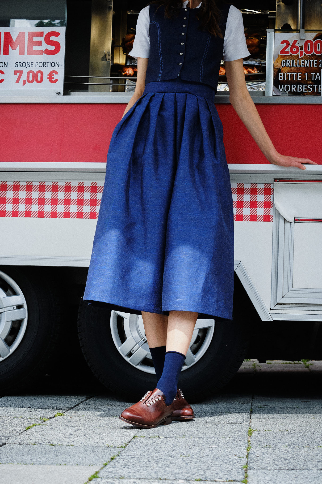 Natalie von Zirbenfux fertigt in München am Rotkreuzplatz puristische Dirndl, Mieder und Röcke aus Leinen-, Woll- und Baumwollstoffen aus lokalen Webereien in Bayern und Österreich.